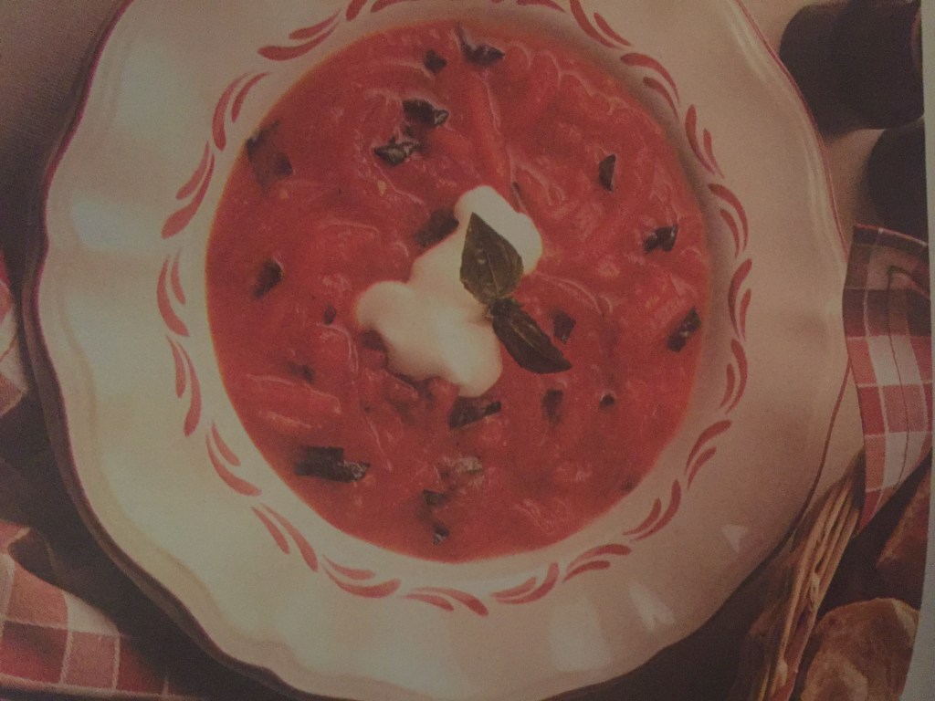 4. Die Suppe auf Teller füllen, Creme fraiche in die Mitte geben und mit den ganzen Basilikumblättern garnieren.