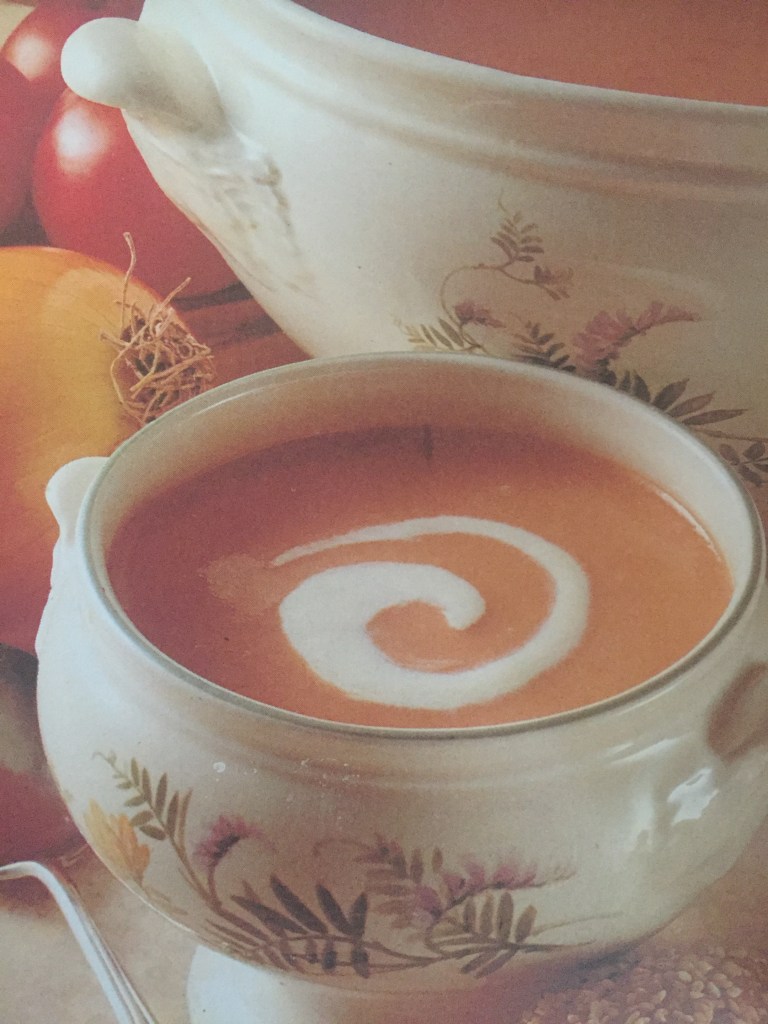 5. Suppe in Suppentassen (Tellern) verteilen und mit Creme double garnieren.